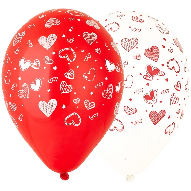 Шары из натурального латекса c шелкографическим рисунком одного цвета, расположенным по всему шару. Все шары одного дизайна. Рисунок в виде рассыпанных сердечек. В одном пакете шары павстель - матовый оттенок цвета красный и белый, и кристалл - прозрачный белый. Предназначенны для использования в розничной продаже как в надутом, так и в не надутом виде.