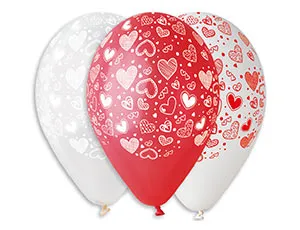 Шары из натурального латекса c шелкографическим рисунком одного цвета, расположенным по всему шару. Все шары одного дизайна. Рисунок в виде рассыпанных сердечек. В одном пакете шары павстель - матовый оттенок цвета красный и белый, и кристалл - прозрачный белый. Предназначенны для использования в розничной продаже как в надутом, так и в не надутом виде.