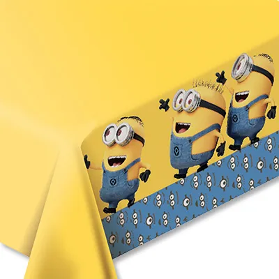 Скатерть с Миньонами! Середина скатерти ярко-жёлтая, а по краям бодро шагают и поют песню весёлые коротыши! Поднимает настроение, упрощает уборку после праздника, заряжает позитивом!