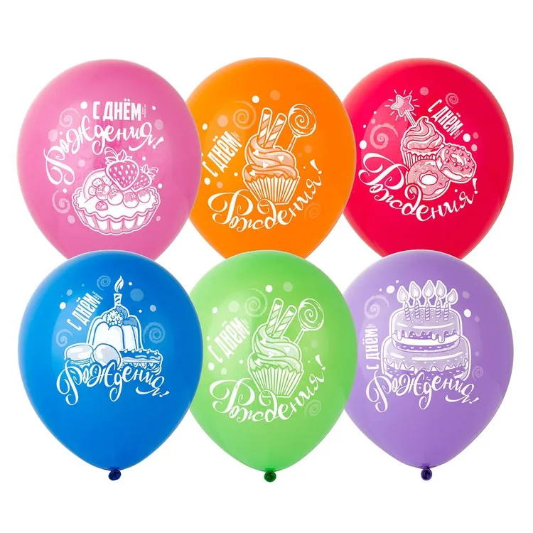 Высококачественный шар из натурального латекса. Ассорти из 10-12 цветов, типа пастель. Шары с двусторонним шелкографическим рисунком. Идеальный ассортимент для розничной продажи воздушных шариков.
