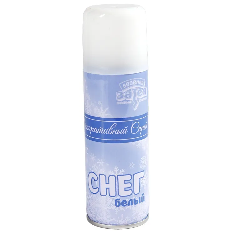 Баллончик с полимерным веществом, создающей эффект выпавшего снега. Предназначен для украшения помещений к Новому году и новогодних елок. Может также использоваться для рисования узоров на окнах и стенах через трафарет. Не исчезает после нанесения. Легко смывается мыльным раствором.