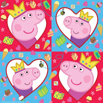 У Свинки Пеппы день рождения, и она так рада принимать подарки вместе со своим братом Джорджем. Все гости нарядились в костюмы и пришли к Пеппе на праздник-маскарад. Нарядные салфетки с портретами Пеппы как нельзя кстати придутся на таком празднике.