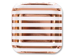 Нарядные бумажные тарелки с полосками цвета розового золота. Универсальны, подходит для любого праздничного фуршета. Выглядят стильн о, нарядно и ярко. В наборе 6 тарелок размером 17 см. Купить красивую одноразовую посуду оптом можно на нашем сайте.