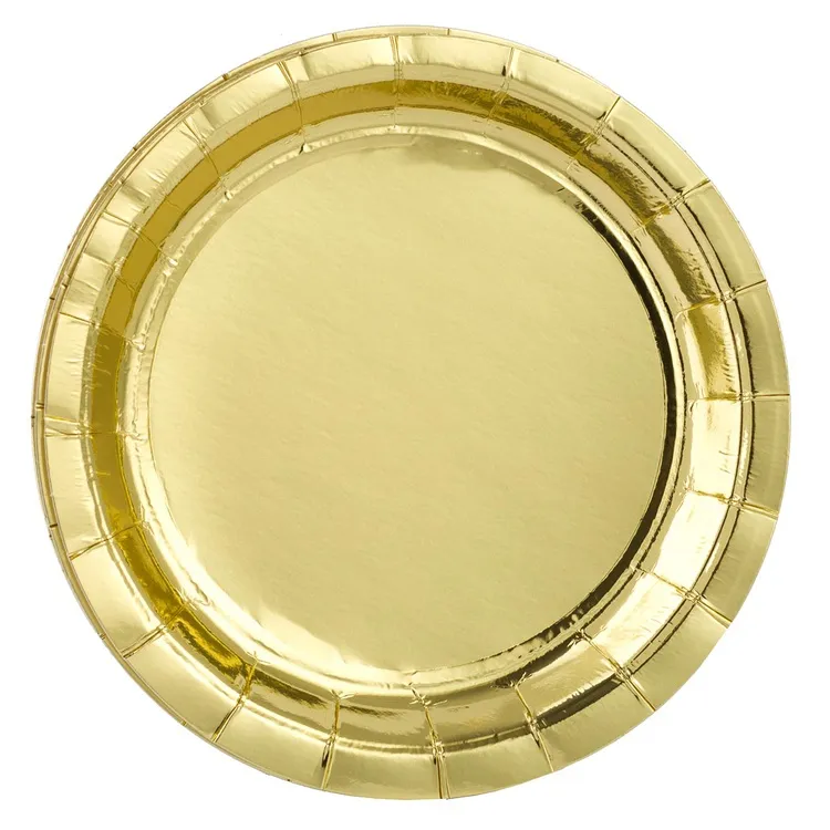 Ламинированные бумажные тарелки золотого цвета. Универсальны, подходит для любого праздничного фуршета. Выглядят стильно, нарядно и ярко. В наборе 6 тарелок золотого размером 17 см. Купить красивую одноразовую посуду оптом можно на нашем сайте.