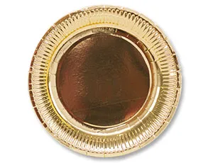 Ламинированные бумажные тарелки золотого цвета. Универсальны, подходит для любого праздничного фуршета. Выглядят стильно, нарядно и ярко. В наборе 6 тарелок золотого размером 23 см. Купить красивую одноразовую посуду оптом можно на нашем сайте.