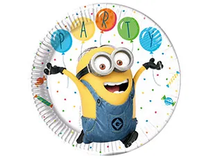 Миньоны Кевин и Дэйв устраивают веселую вечеринку - будут все и целое облако воздушных шаров! Приходи! В упаковке 8 ламинированных бумажных тарелок размером 23 см.