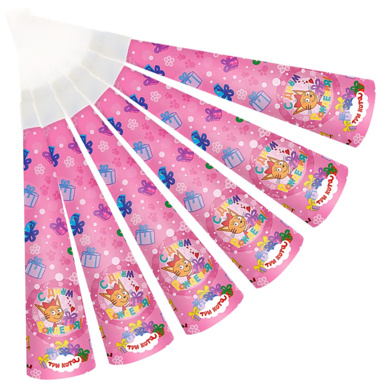Игрушки-свистульки горны, издавая забавные звуки, предадут празднику веселья и шума, что так нравится детям! Рекомендуем использовать вместе с другими элементами из коллекции "Три кота" (тарелки, стаканчики, колпаки, хлопушки, языки, салфетки, свечи, мыльные пузыри)